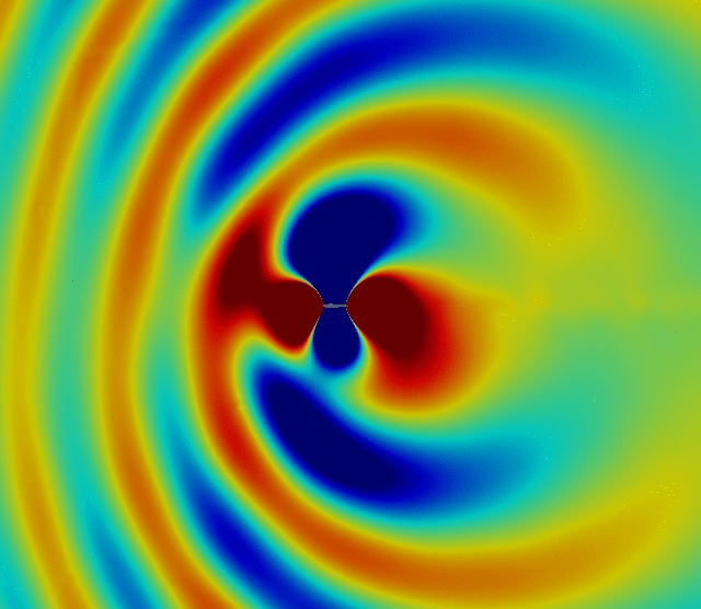 Acoustic field generated as wakes in the form of vortical gusts interacts with a single wing profile simulated using the G3D::Flow harmonic balance solver.