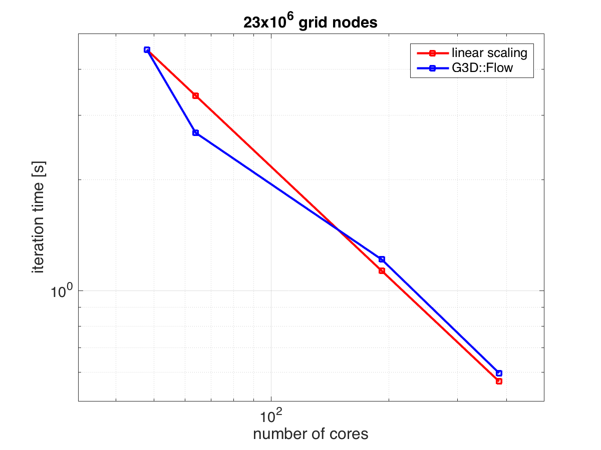 The compressible flow solver has excelent scaling properties. As shown in the figure, it scales linearly up to, at least, 400 cores.